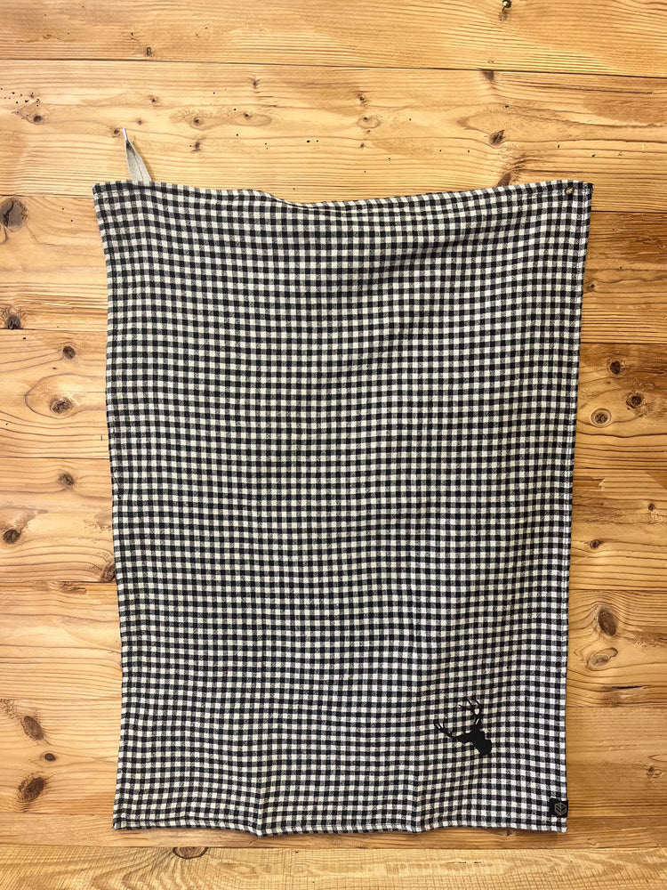 Tovaglioli in lino con motivo quadrettoni o quadretti sui colori del grigio e beige con un tocco di originalità dato dal cervo ricamato a contrasto.