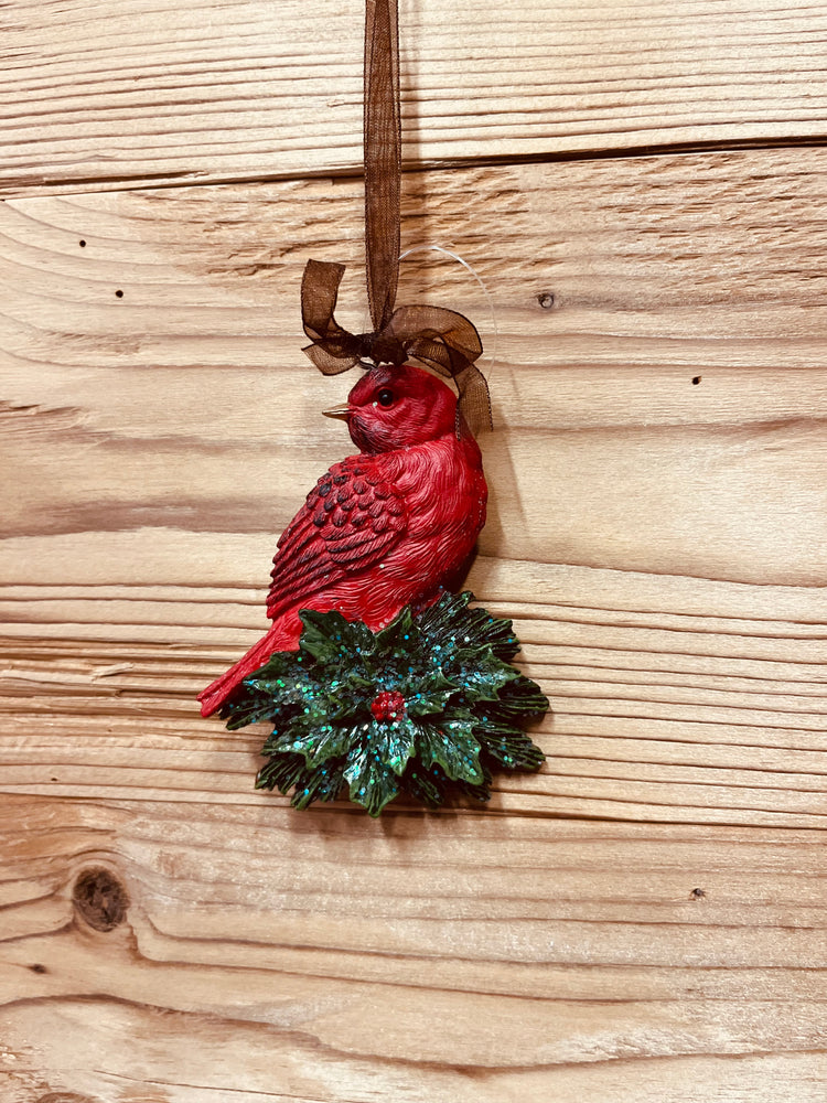 Decorazioni per albero di natale in resina color rosso e verde con parti brillantinose.