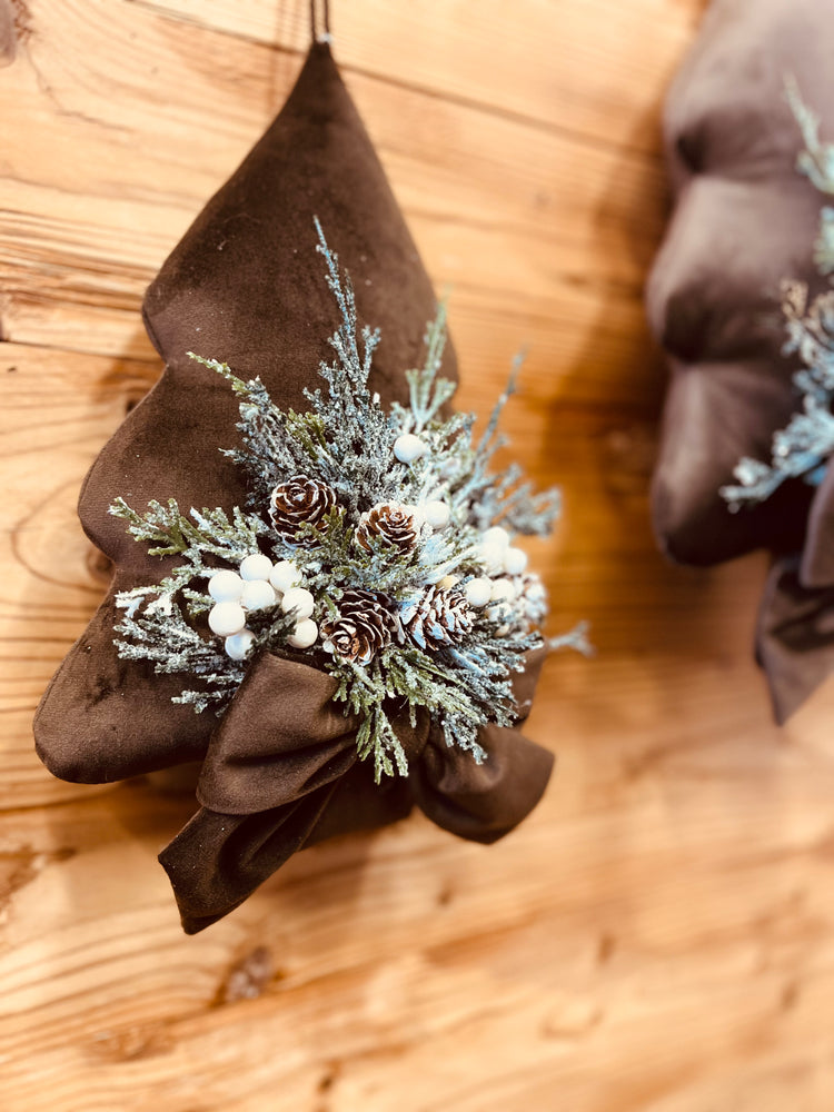 Alberello in velluto con caratteristica applicazione natalizia. Con laccetto per appenderlo e nastri decorativi.