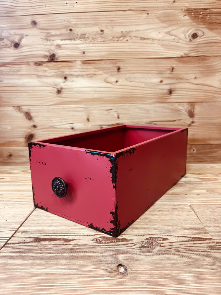 Cassetto decorativo rosso effetto rovinato vintage con pomello scuro.