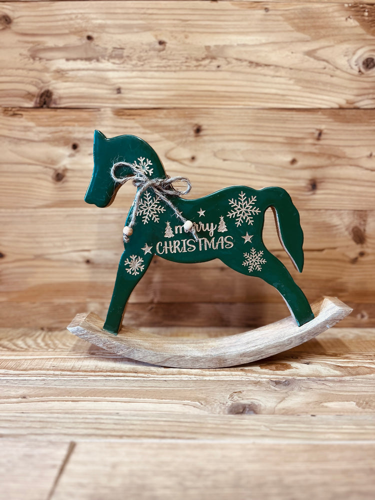 Cavallino a dondolo in legno, verniciato di verde opaco e con fiocchi di neve e scritte oro con i brillantini.