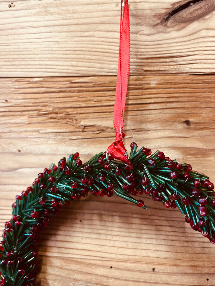Ghirlanda decorativa a forma di cerchio con anima in ferro e perline effetto rametti. Con laccetto per poterle appendere.