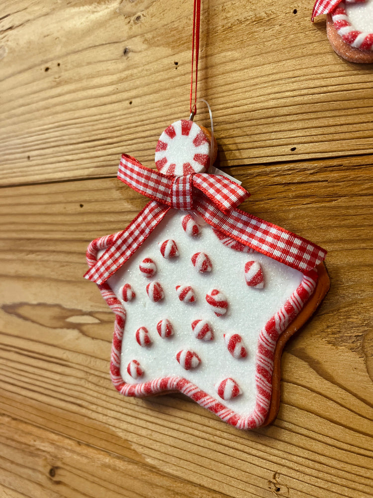 Decorazione in plastica con spolverata di brillantini per rendere tutto un po' più magica e laccetto per poterli appendere. Effetto biscotti.