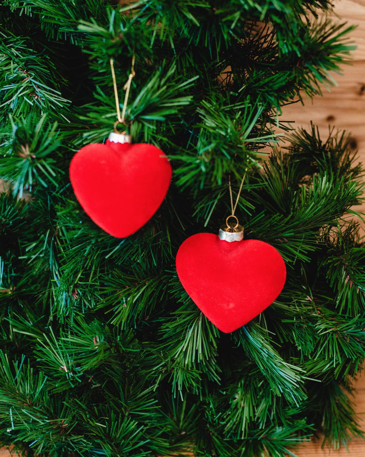Globi per albero di Natale in velluto rosso a forma di cuore con laccetto oro.