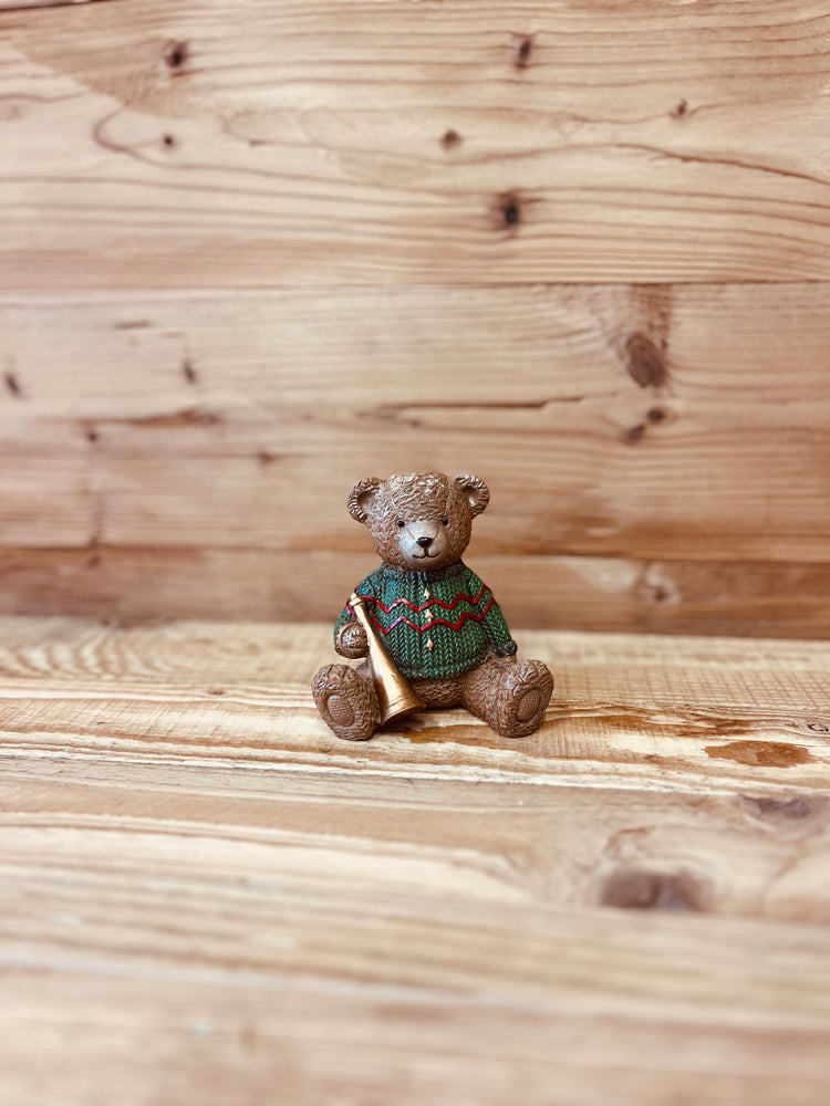 Orsetti seduti con maglioncino e trombetta o pacco regalo in mano.
