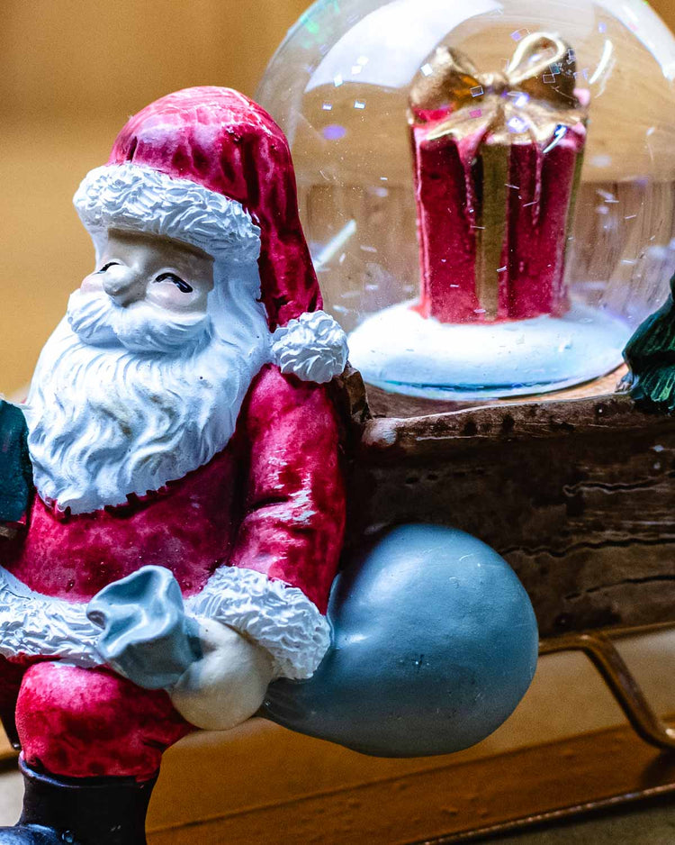 Babbo Natale sulla slitta che porta un dono prezioso, sfera acqua con pacco e brillantini.