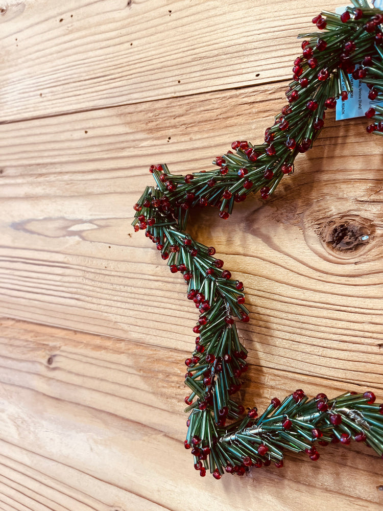 Ghirlanda decorativa a forma di stella con anima in ferro e perline effetto rametti. Con laccetto per poterle appendere.