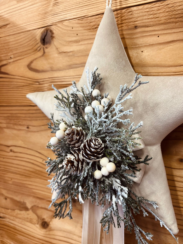 Stella in velluto con caratteristica applicazione natalizia. Con laccetto per appenderla e nastri decorativi.