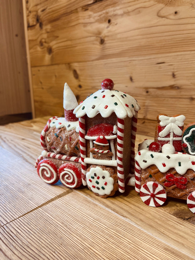 Trenino decorativo effetto pan di zenzero con dolci, ghirlande e alberi nei carretti dietro.