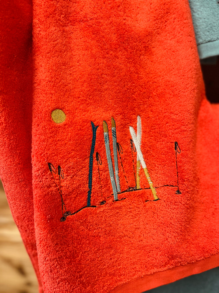 Asciugamani francesi in morbido cotone a tema sci, fondo azzurro o vermiglio con ricami raffiguranti attrezzatura da sci.