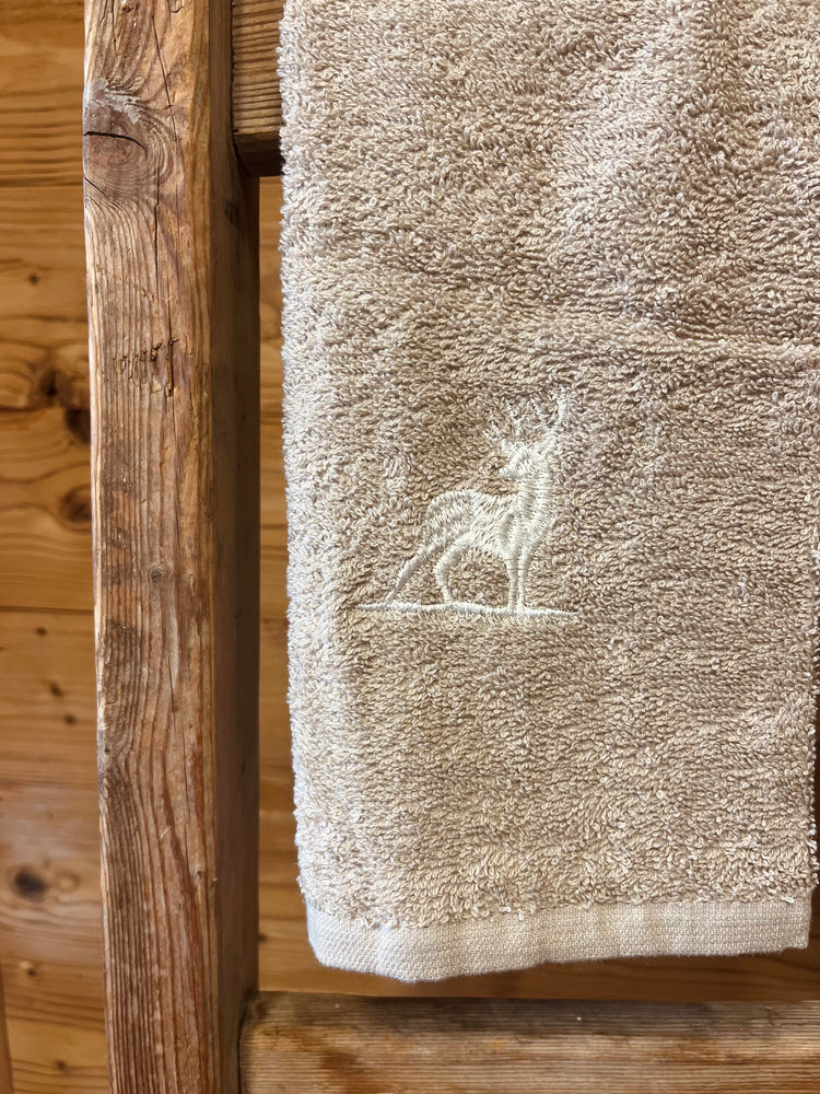 Coppia di asciugamani in morbida spugna raffigurante un paesaggio montano ricamato.