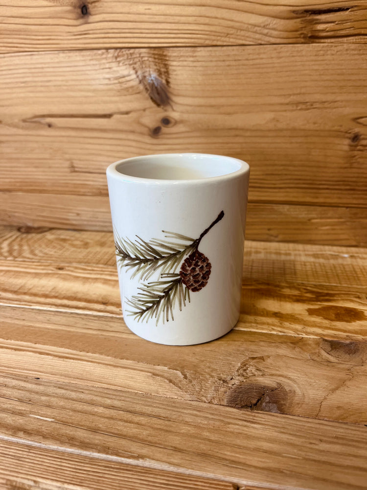 Bicchiere, dispenser in ceramica con disegno pigna dipinto a mano e successivamente coperto per proteggerlo.