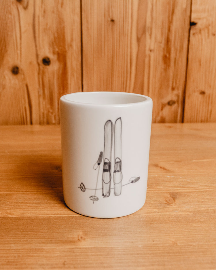 Bicchiere o dispenser in ceramica con disegno sci e racchette effetto dipinto.