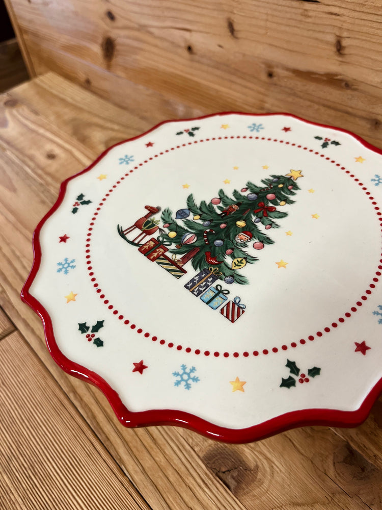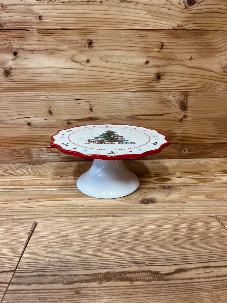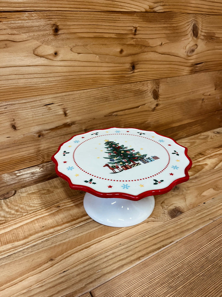 Alzata per torte o dolci in stile natalizio con alberello e doni disegnati.