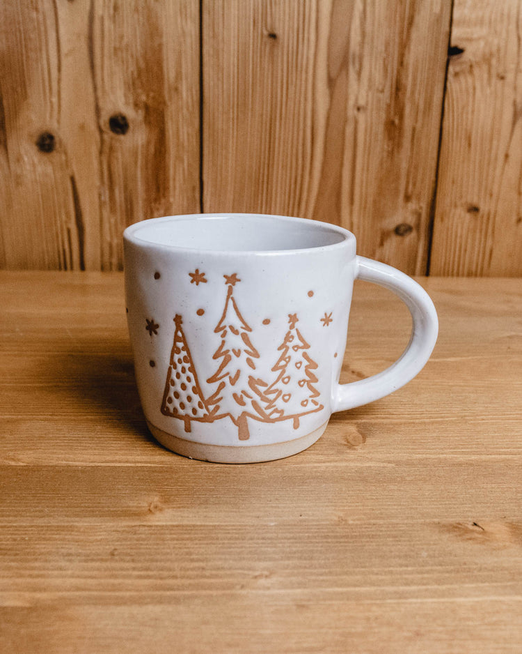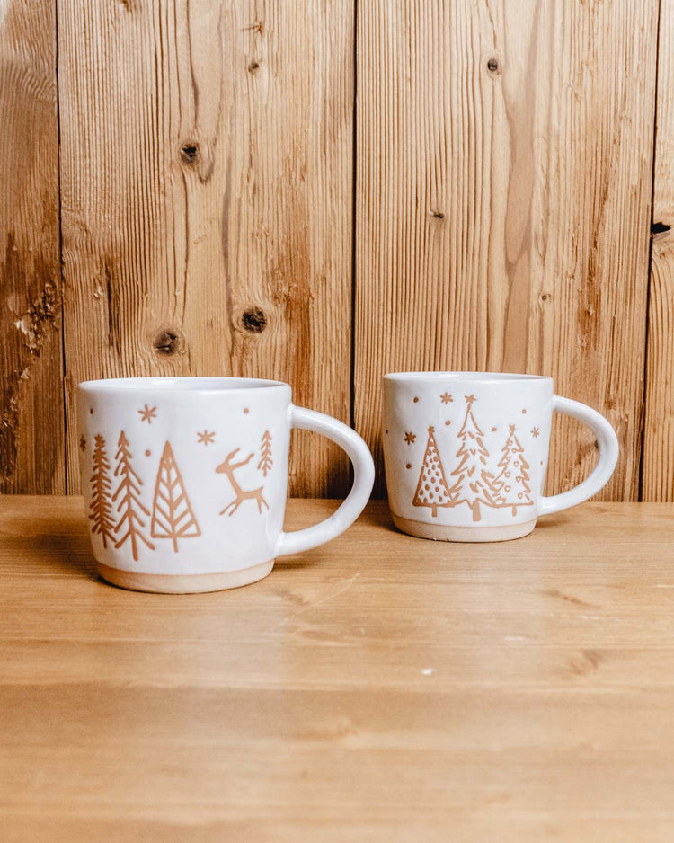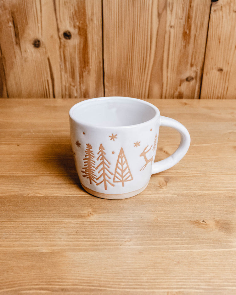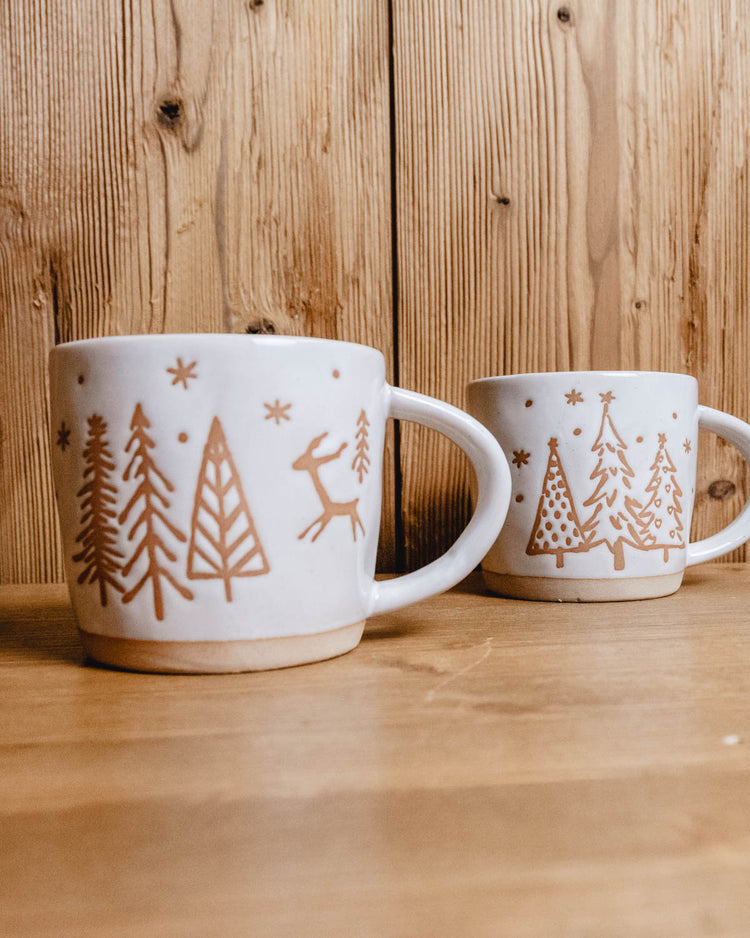 Tazza con alberelli e cervetto in design stilizzato, realizzato in terra cotta. Smaltato con effetto pan di zenzero.