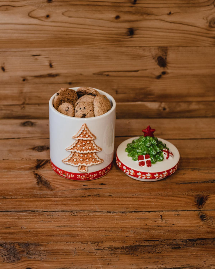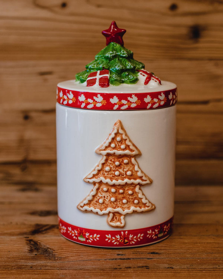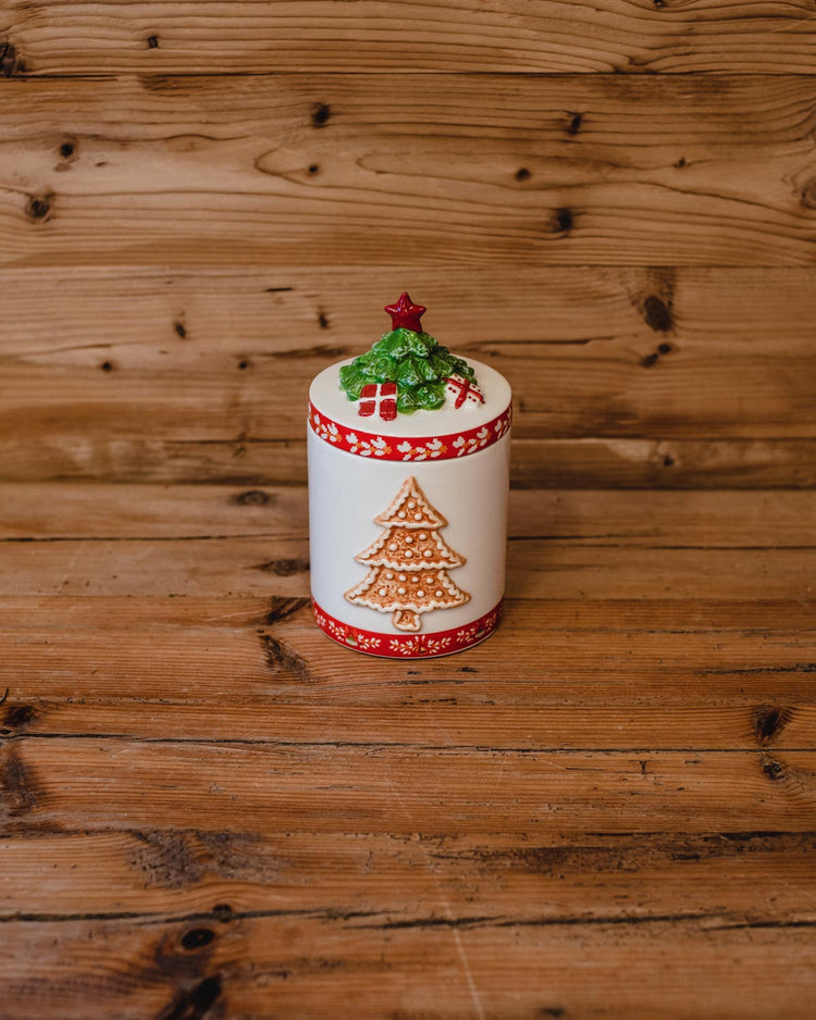 Barattolo su base bianca con decorazione albero pan di zenzero e alberello con regali sul coperchio.