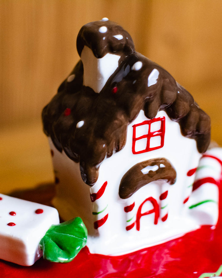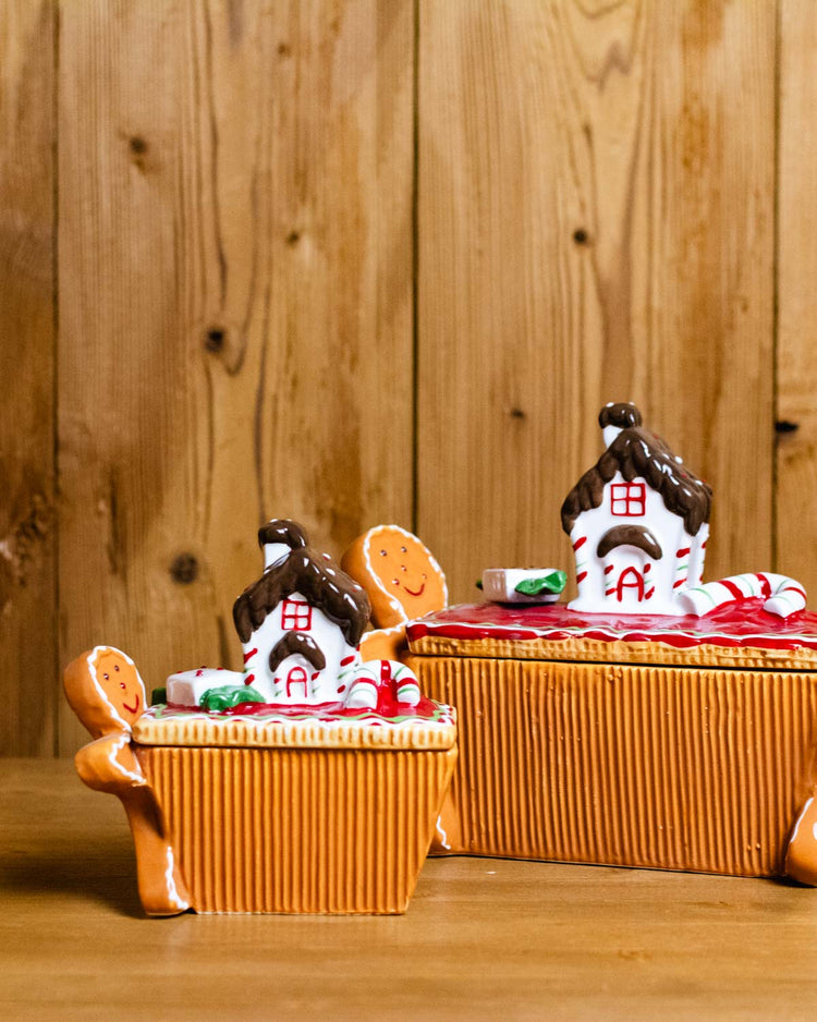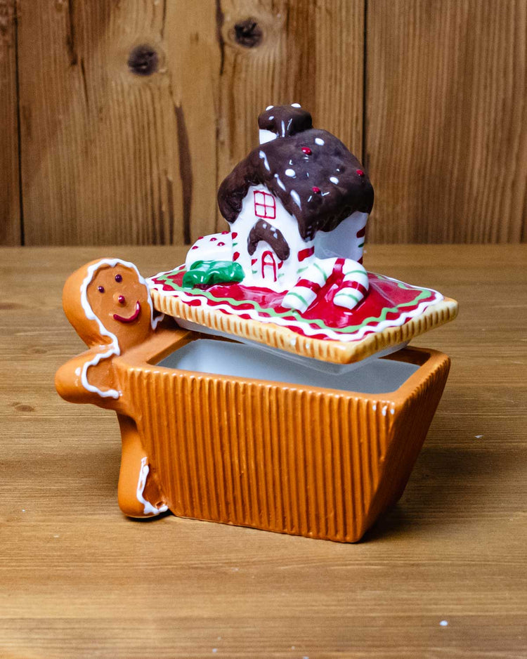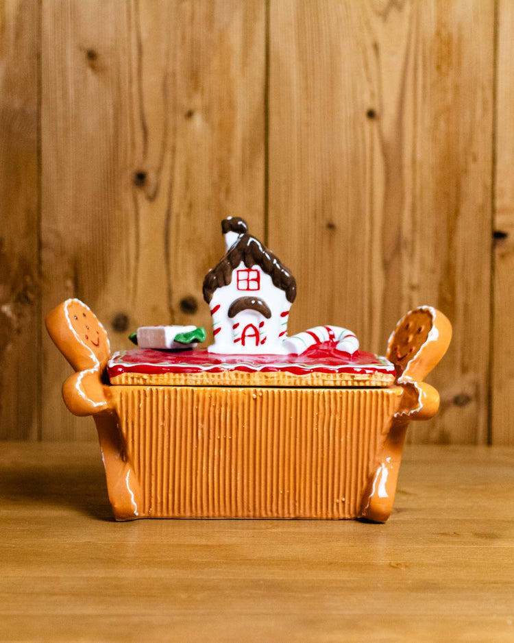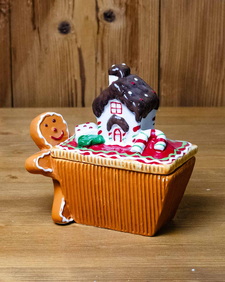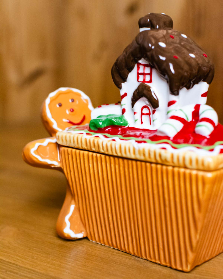 Barattolo con coperchio ad incastro decorato con biscotti pan di zenzero e casetta dei dolci.