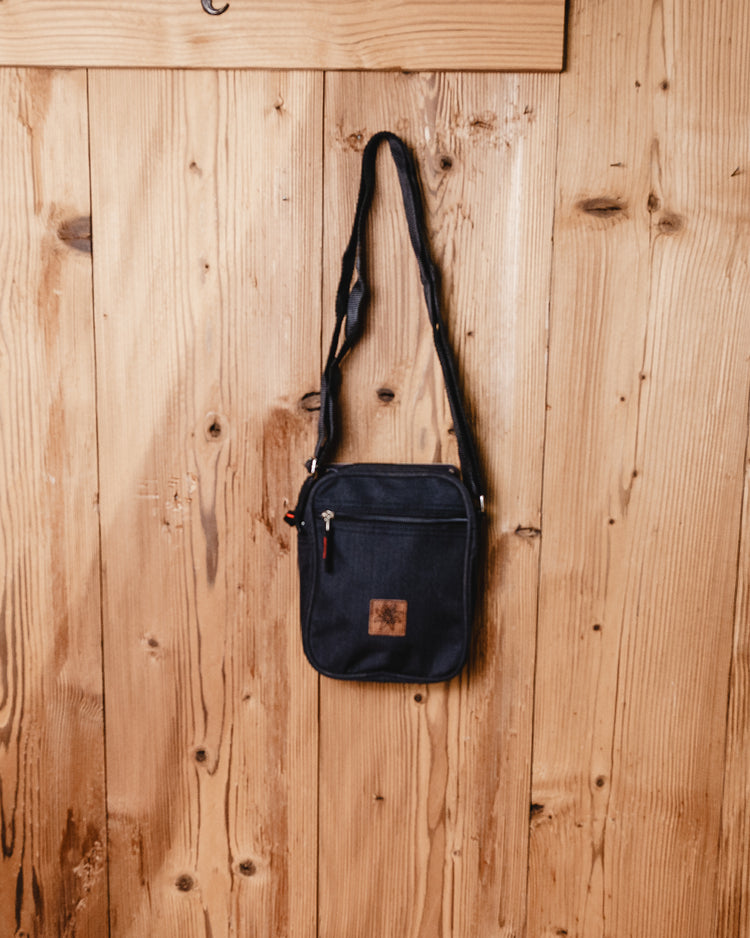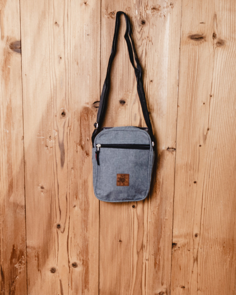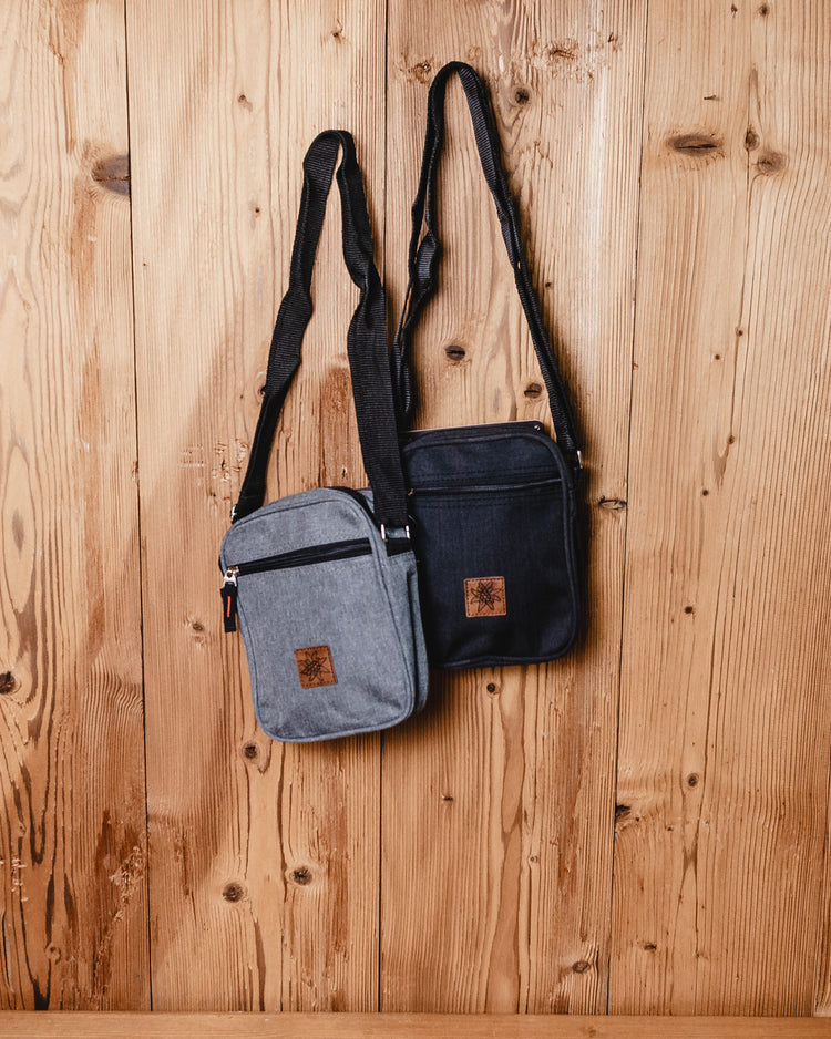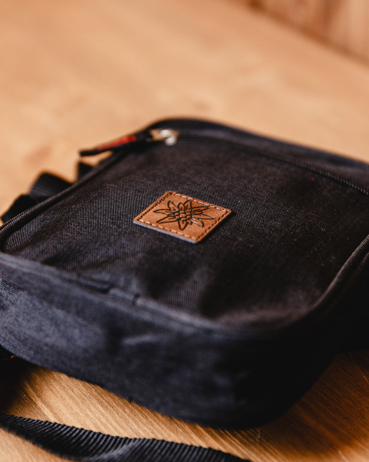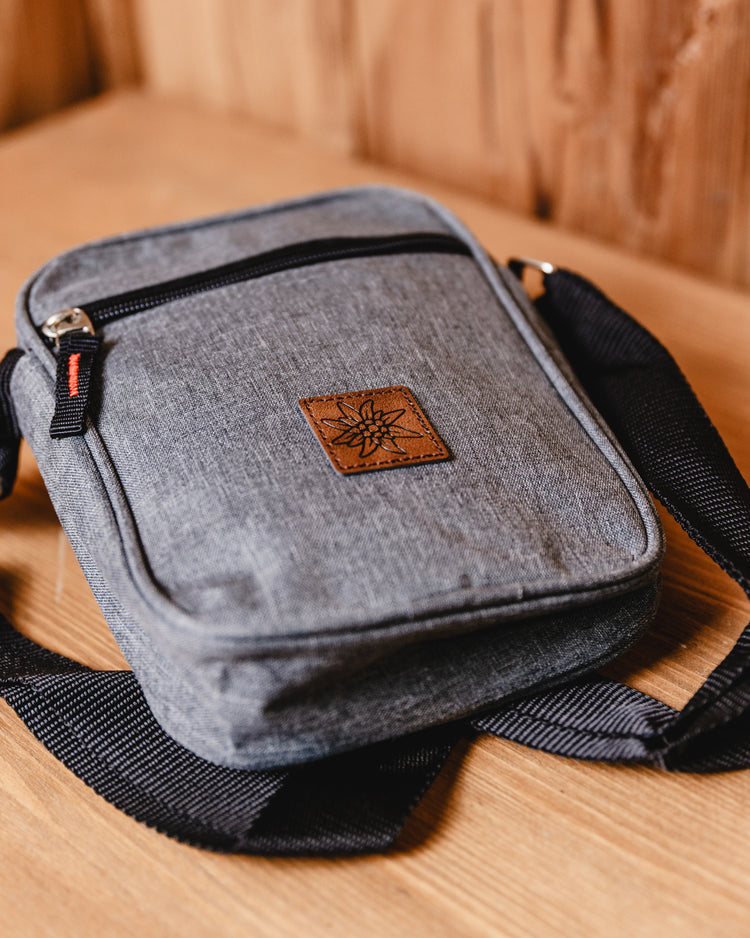 Borsello con tracolla, fondo tinta unita effetto sale e pepe con applicazione in ecopelle e stella alpina serigrafata.