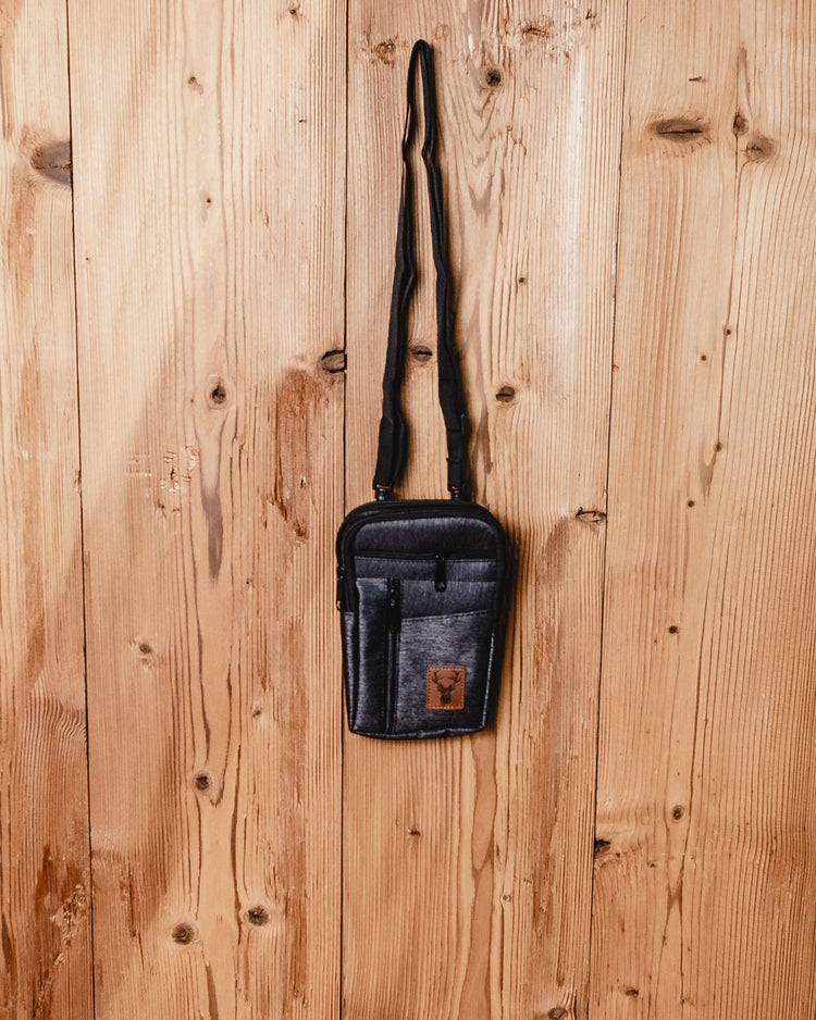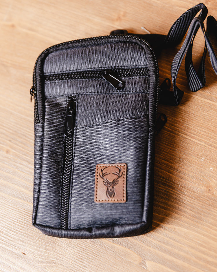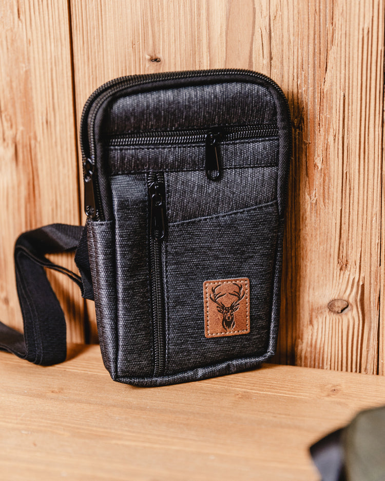 Porta telefono fondo tinta unita con applicazione in ecopelle e cervo serigrafato.
