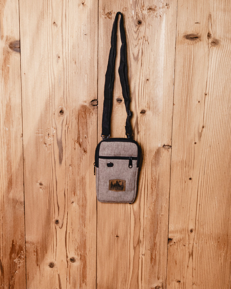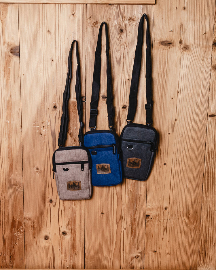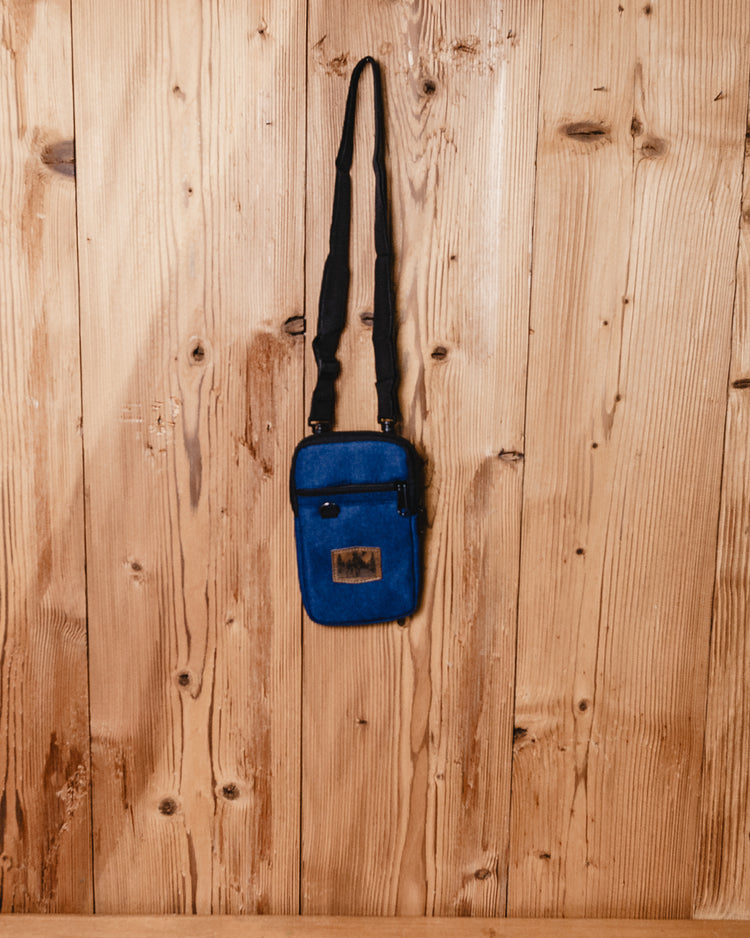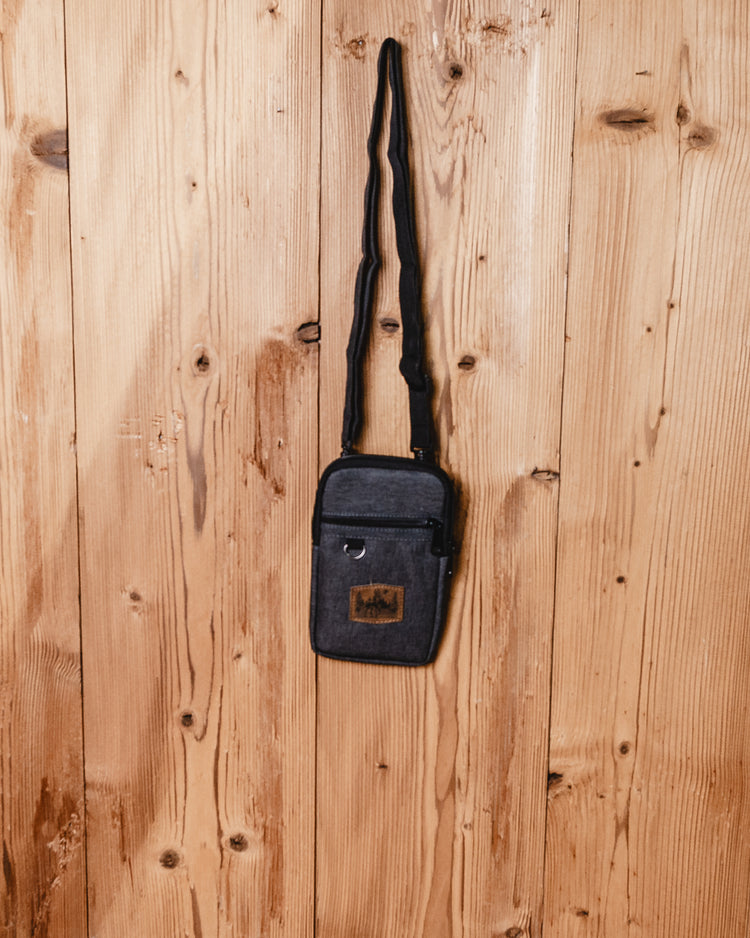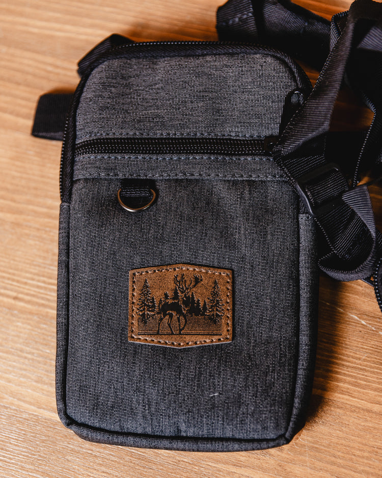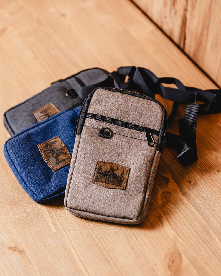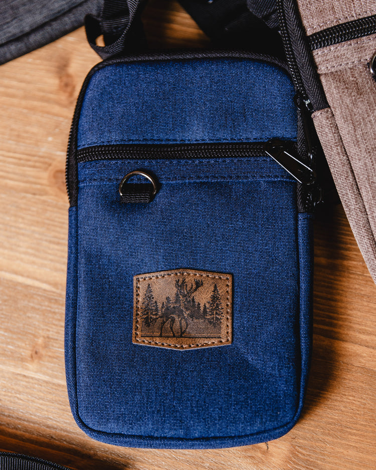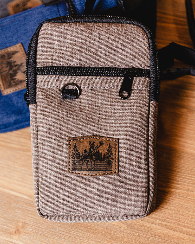 Porta telefono fondo tinta unita con applicazione in ecopelle e foresta serigrafata.