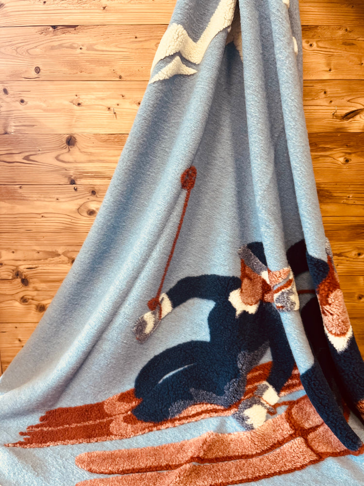 Coperta in lana Bollita con raffigurazione sciatori e montagne in rilievo.