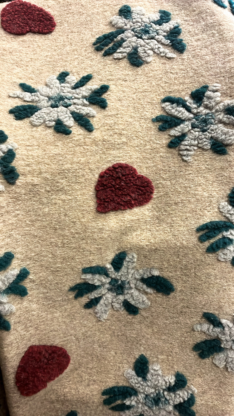 Coperta in lana bollita con cuori e edelweiss in rilievo.