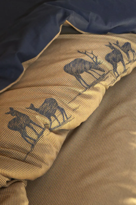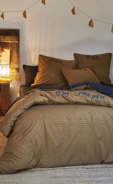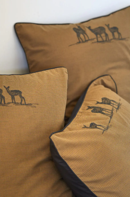 Questa biancheria da letto ispirata alla natura selvaggia ha un lato della passeggiata nei boschi, sorprendendo un branco di cervi al calar della notte. Un desiderio di autenticità rustica lavorato con gamme di colori dove le sfumature della natura autentica trovano un'eco grafica con un nero carbone.