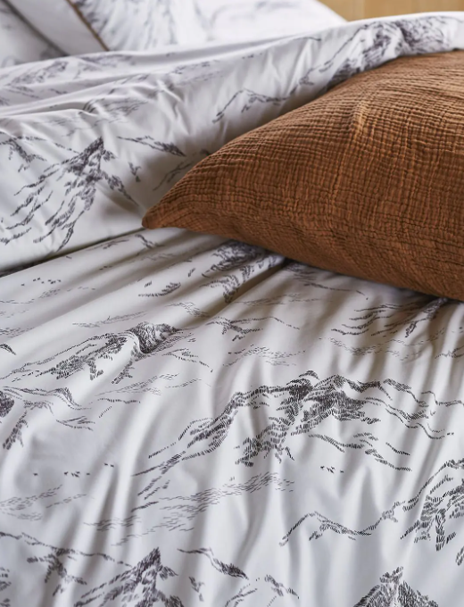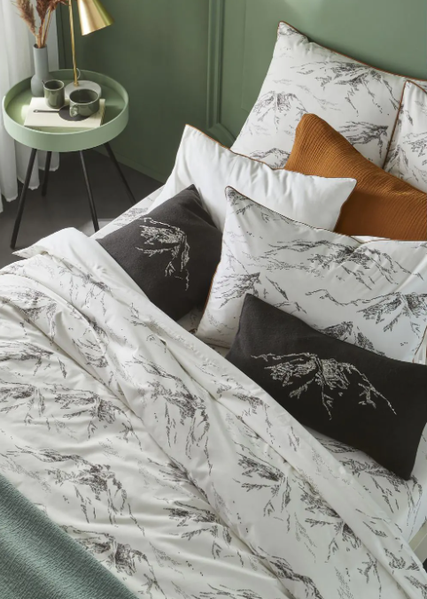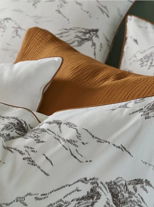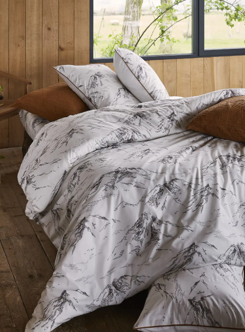 Ti invitiamo in cima al mondo per sederti e ammirare il panorama. Il percalle bianco sporco su cui è stampato questo meraviglioso panorama offre una bella purezza . In uno stile ispirato alle antiche incisioni, le montagne sono realizzate con un susseguirsi di piccole linee color seppia (marrone scuro) che descrivono i rilievi con finezza e modernità. Infilati discretamente tra i pendii rocciosi, i branchi di camosci salgono con agilità verso le vette. Le federe e il lenzuolo sono decorati con pregiati profili color caramello.