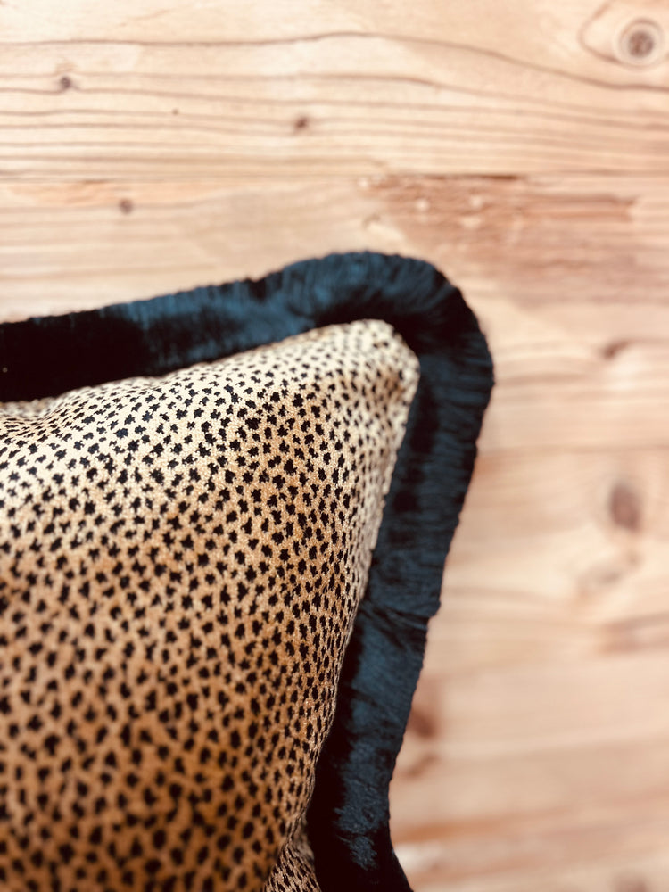 Cuscini d'arredo in stile animalier, la misura quadrata ha le frange nere perimetrali, per darle un tocco di stile in più.