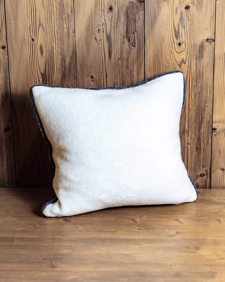 Cuscino in lana bollita bianca, prodotto in Italia con disegno di funivie rosse in rilievo e bordino perimetrale antracite.