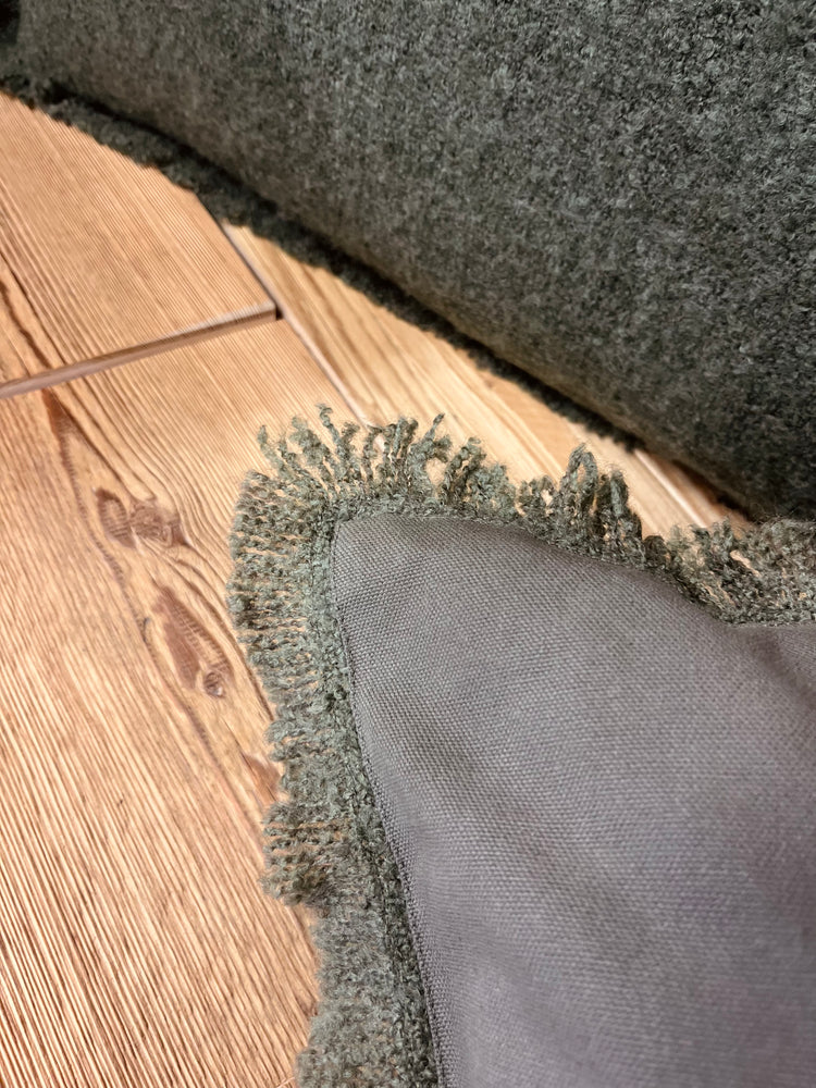 Cuscino in bouclè di lana con frange perimetrali, retro in tessuto di cotone effetto grezzo.