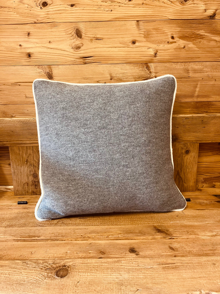 Cuscino in lana bollita con rappresentazione in rilievo di baita e alberi.