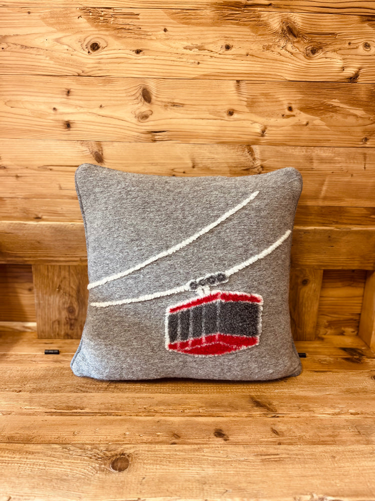 Cuscino in lana bollita con rappresentazione in rilievo di funivia rossa.