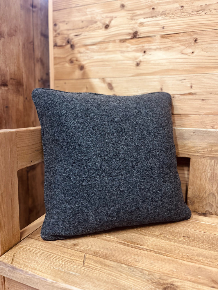 Cuscino in lana bollita con rappresentazione in rilievo sciatori o mascherina con berretto.