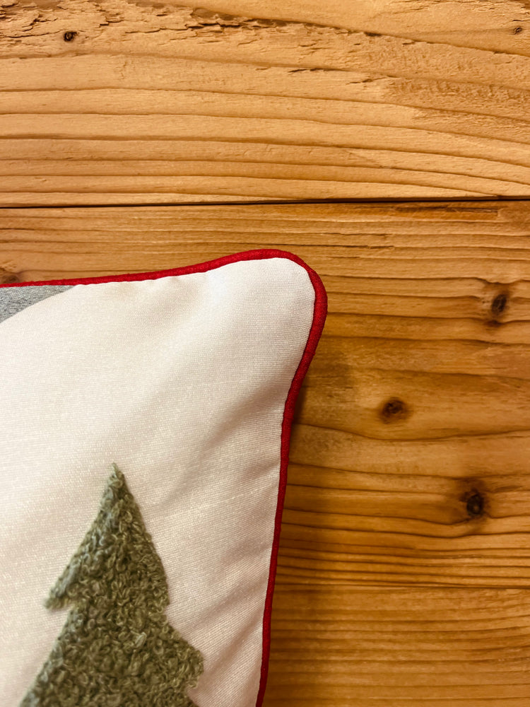 Cuscino con scenario invernale e dettagli in rilievo. Bordino perimetrale rosso.