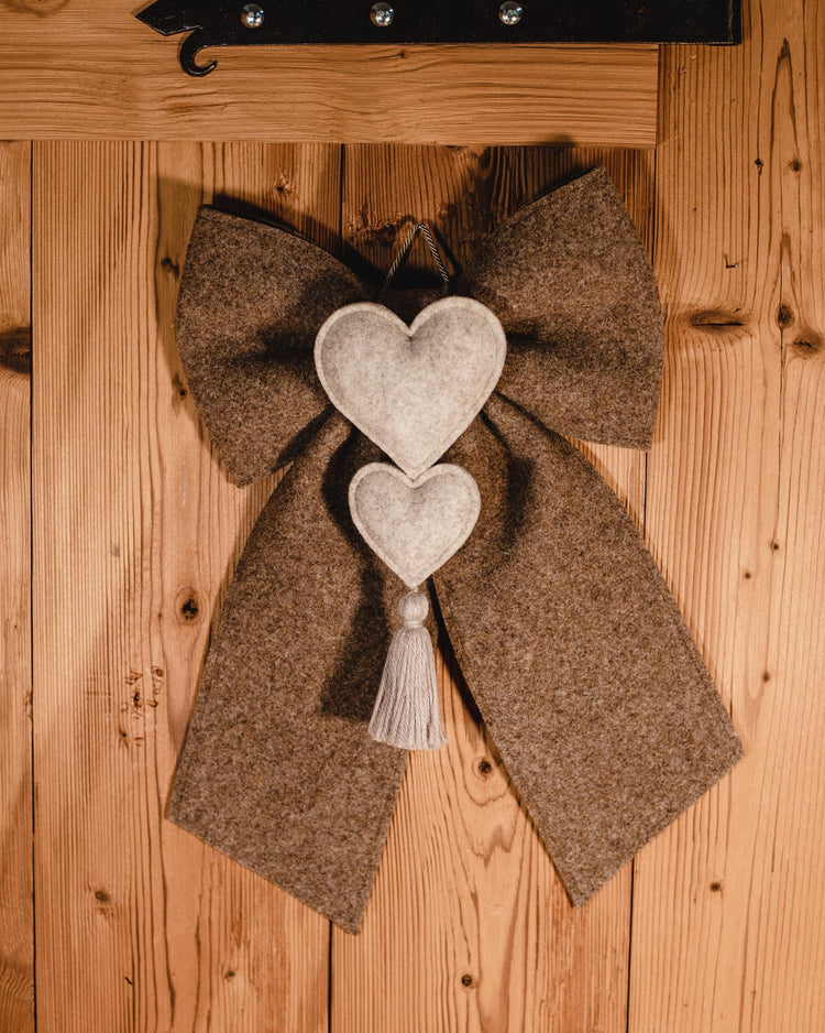 Fiocchi in loden con cuoricini e nappa in contrasto applicati, ideali per decorare la porta o da parete.