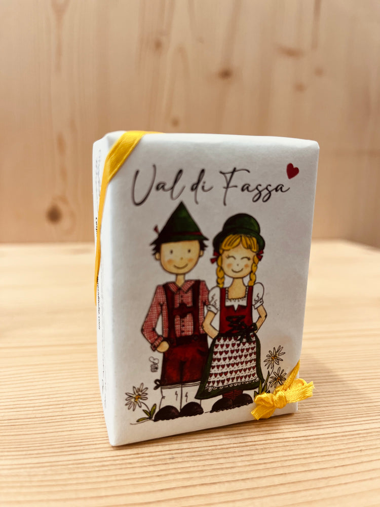 Saponetta profumata con coppia tirolese in abiti tipici e scritta "Val di Fassa" sul retro.