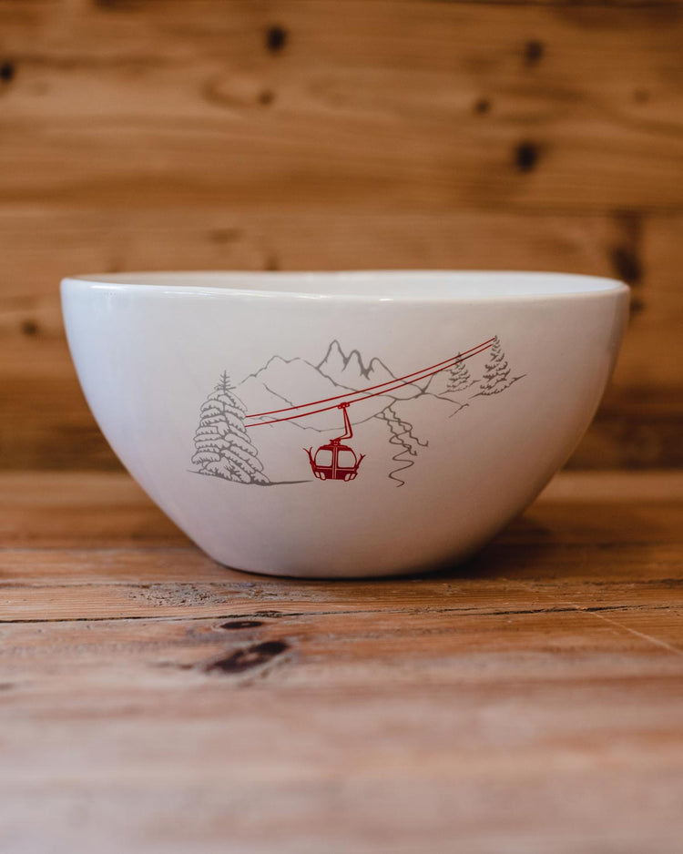 Insalatiera in ceramica con disegno di Cabinovia rossa + alberi e montagne color tortora.