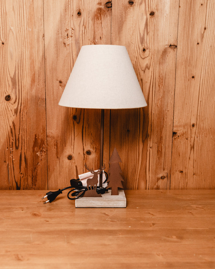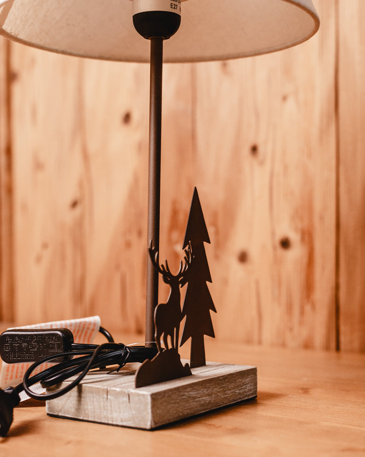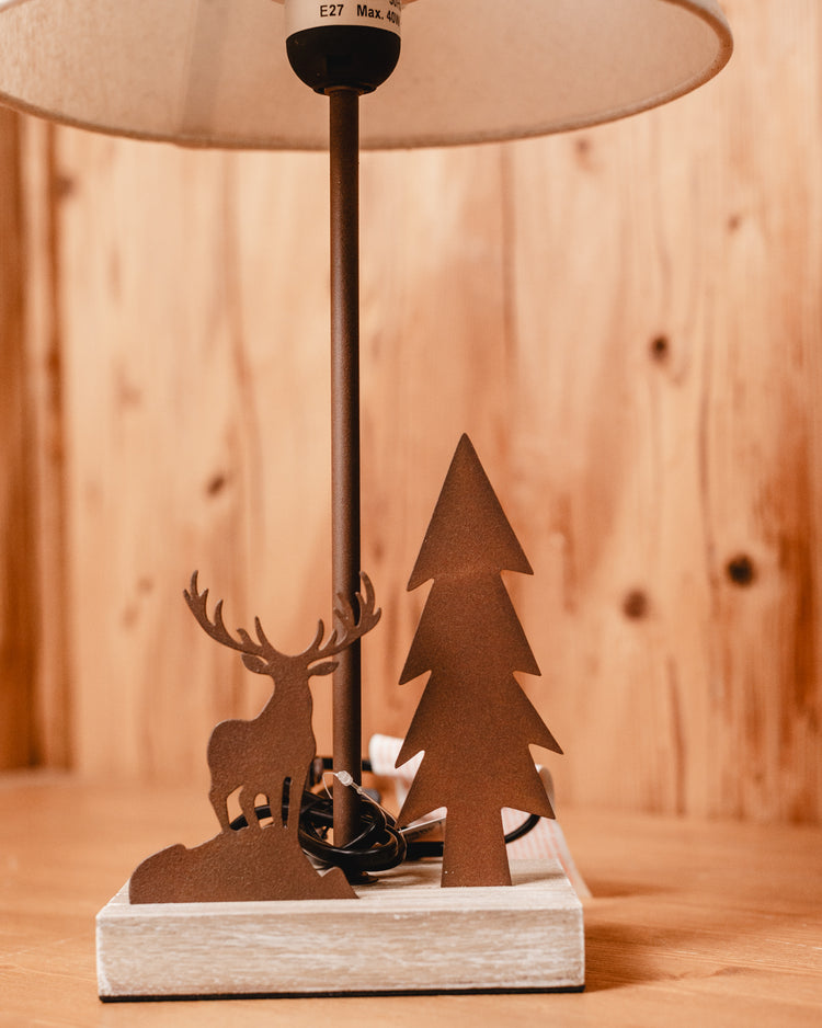 Lampada con base in legno con decorazione albero e cervo in metallo il paralume è in tessuto tinta unita.