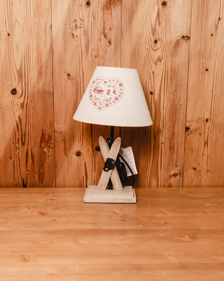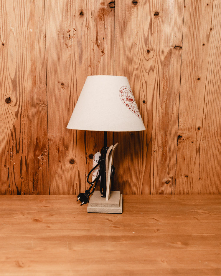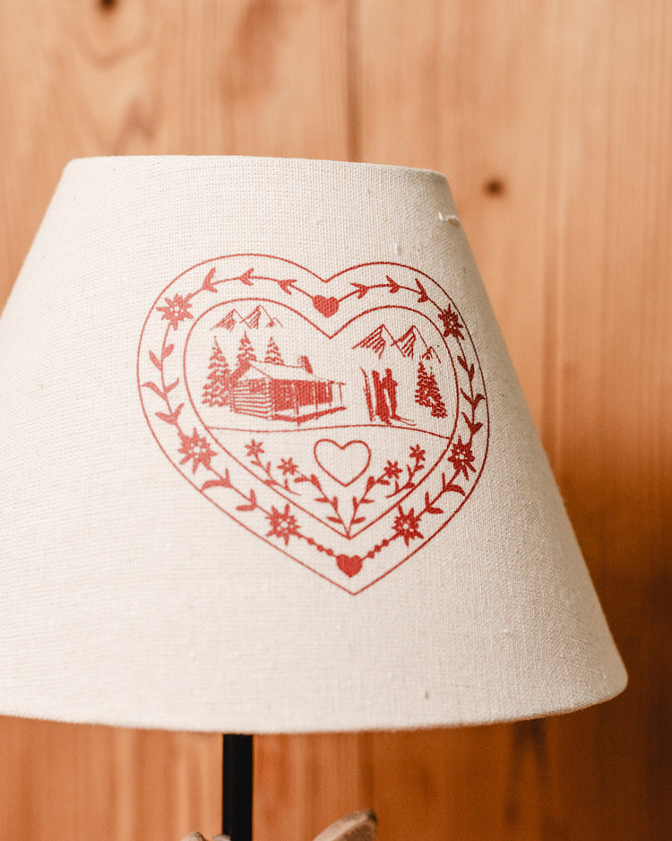 Il paralume è in tessuto con stampa in contrasto rosso.