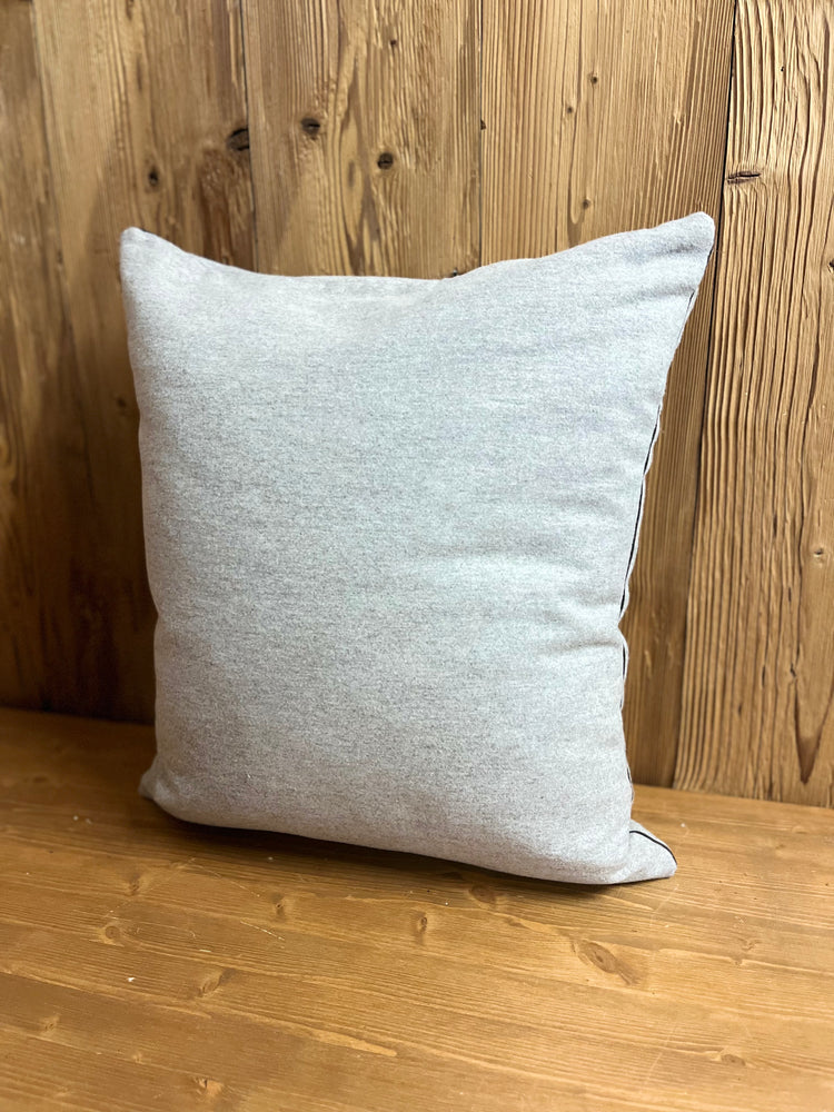 Cuscino in lana con bordino e grande ricamo di un cervo in posa elegante.