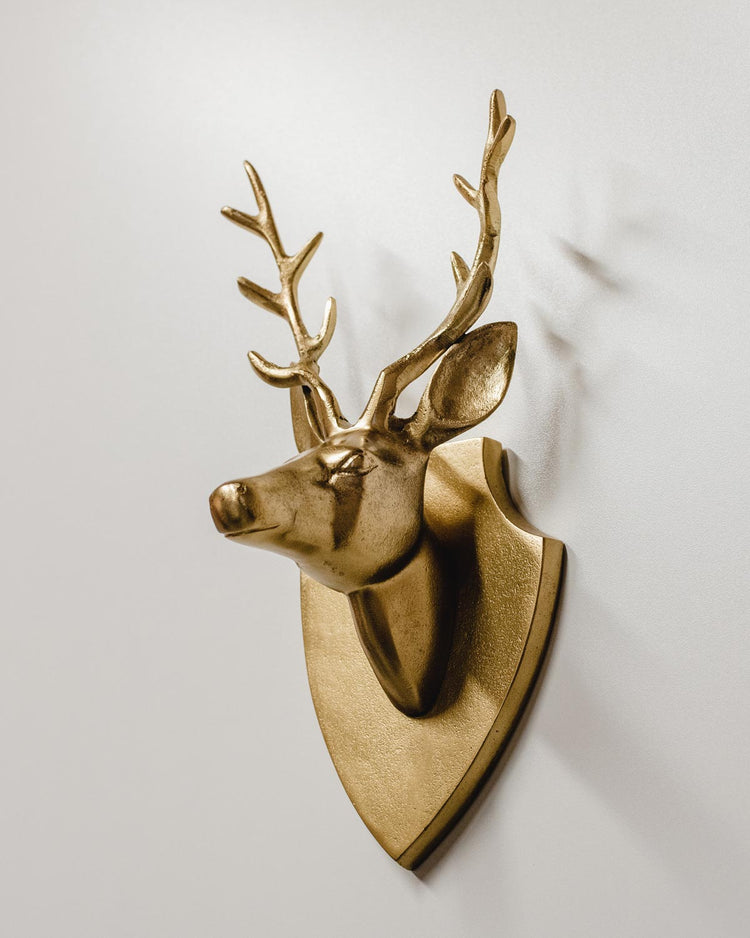 Trofeo di cervo in alluminio dipinto in oro.