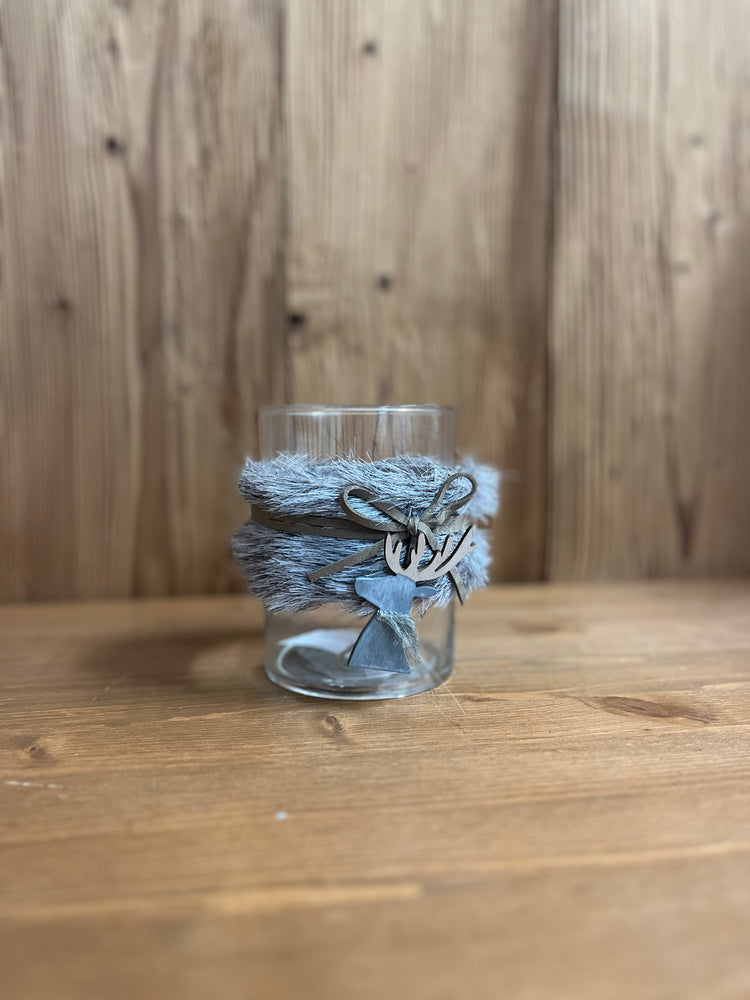 Vasetto in vetro decorato con eco-pelliccia, loden e applicazioni.
