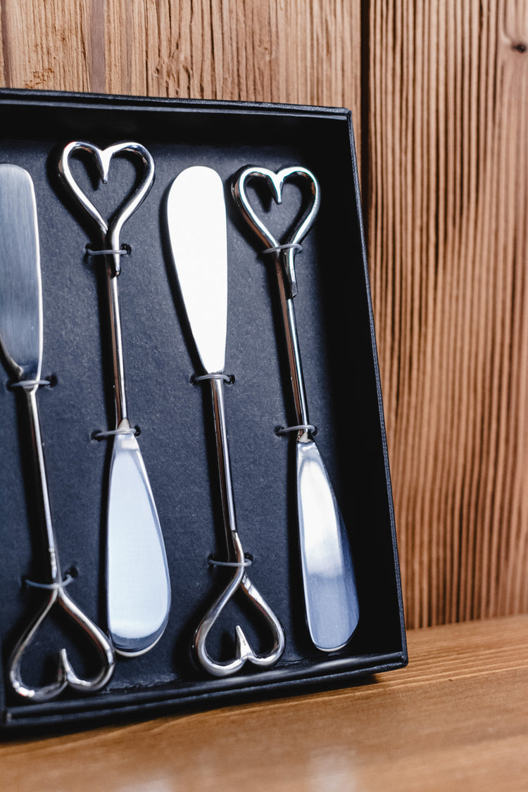 Quattro coltellini da burro in acciaio inossidabile finiti con un dolce cuore sormontato, aggiungendo un tocco di eleganza nei momenti condivisi.