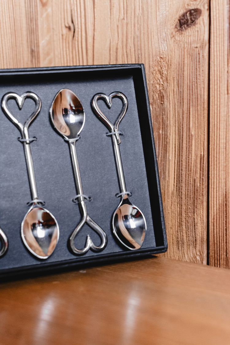 Quattro cucchiaini in acciaio inossidabile finiti con un dolce cuore sormontato, l'accessorio perfetto che riempirà l'aria d'amore