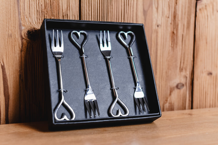 Quattro forchettine da dolci in acciaio inossidabile finiti con un tenero cuore sormontato, aggiungendo un tocco di eleganza nei momenti condivisi.