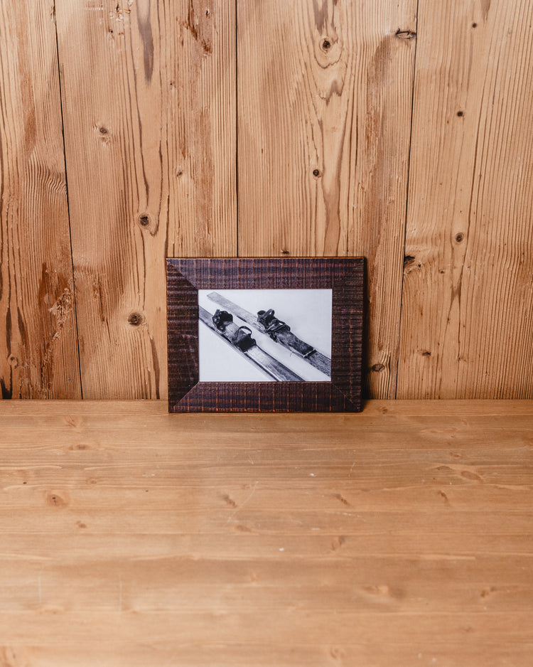 Quadretti con foto in bianco e nero di dettagli e momenti di felicità sulla neve.