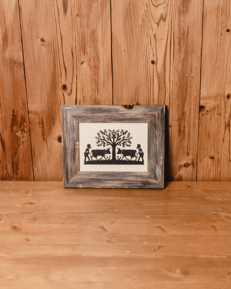 Quadretti con disegni stilizzati di ambientazioni rurali in montagna.