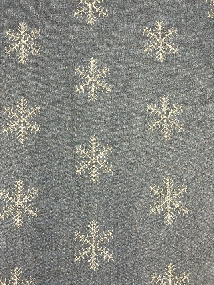 Tessuto in lana azzurrino con ricami fiocco di neve bianco.