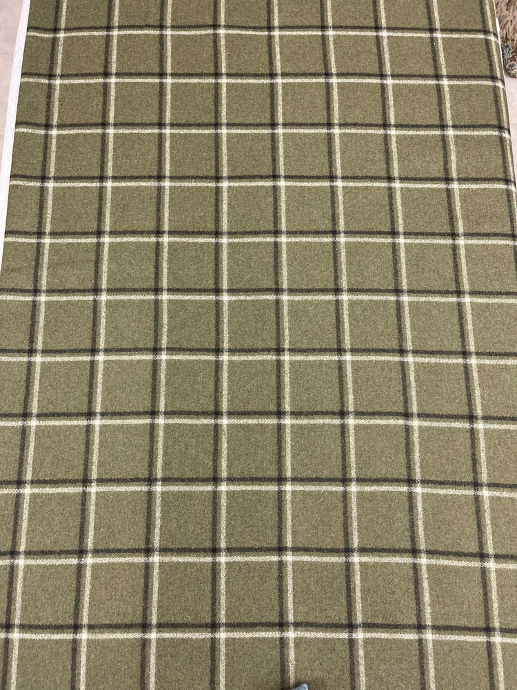 Tessuto in lana verde con linee in contrasto bianco e antracite.